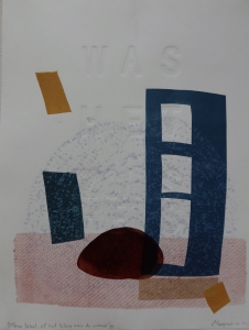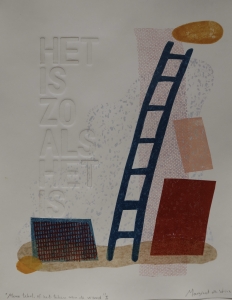 In de zomer van 2025 een serie monoprints/blinddruk gemaakt met als thema: ‘Mene tekel of het teken aan de wand’. Over de woorden het is zoals het is, een tekst die misschien niet zo’n waarheid is als we denken en wat zeggen deze woorden als je ze in een andere volgorde zet. Deze woorden zijn blind in het papier gedrukt en alleen zichtbaar onder een bepaalde belichting: als een teken aan de wand. Met kleur, textuur en vormen is het beeld verder versterkt.